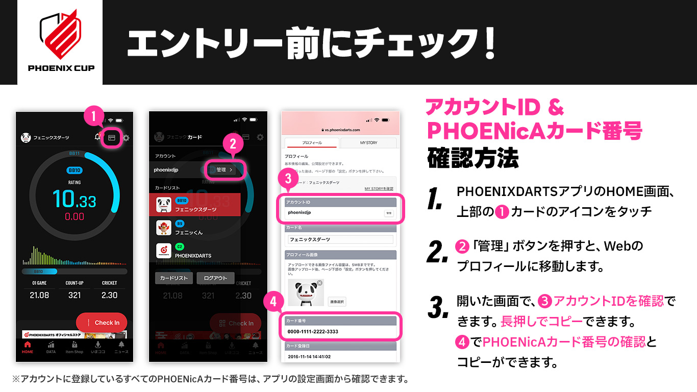 今大会は、大会アプリ「P.TOS」を利用するため、エントリー時にフェニックスダーツ アカウントIDと、PHOENicAカード番号の申請が必須になっております。